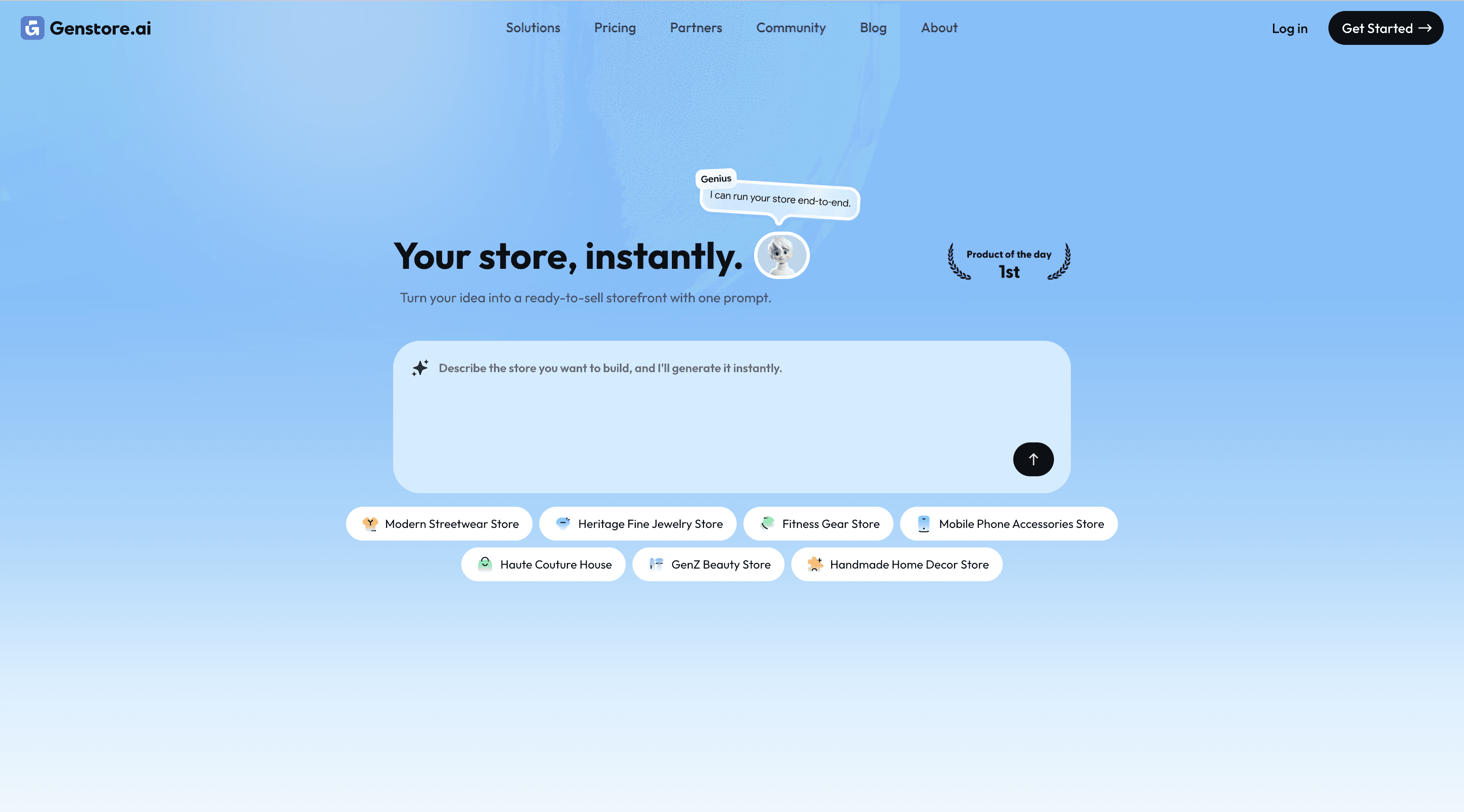 Genstore uses its Design Agent (Dean) to generate store layouts from text prompts. Describe what you want, and the AI creates it. The results are clean and professional, but you're limited to what Genstore's design system supports. There's no Shopify theme ecosystem to draw from.